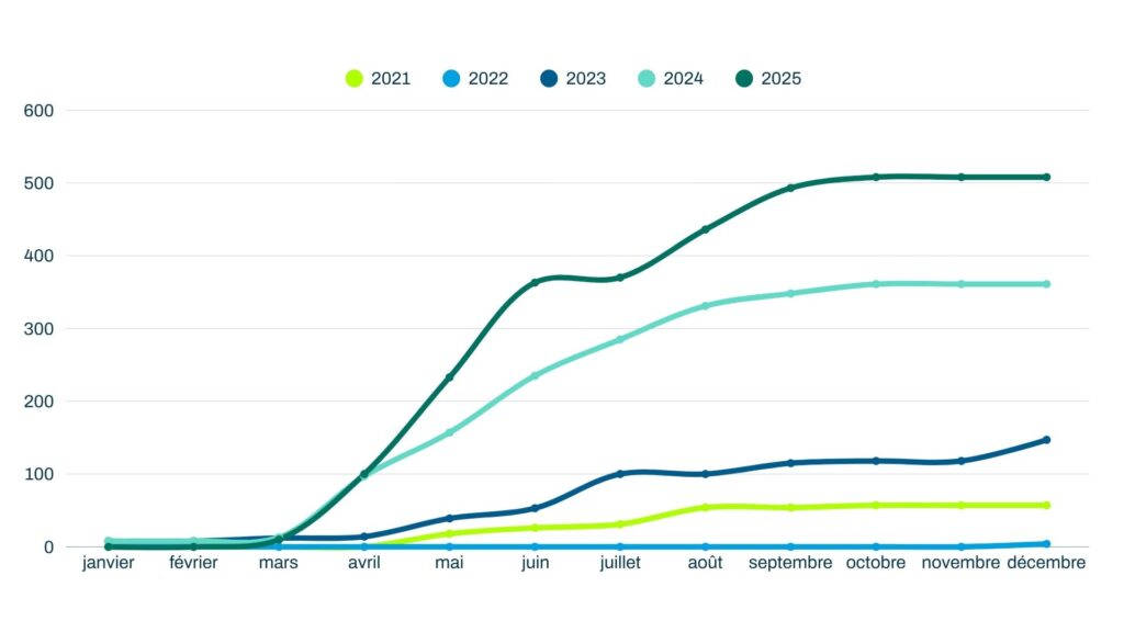 À la fin du mois de octobre 2025, le nombre d’heures de prix négatifs sur le marché spot en France a atteint un total de 508 heures, soit 5,8 % des heures de l’année. En comparaison, il était de 361 en 2024 et de 147 en 2023, soit respectivement 4,12 % et 1,67 % des heures de l’année.