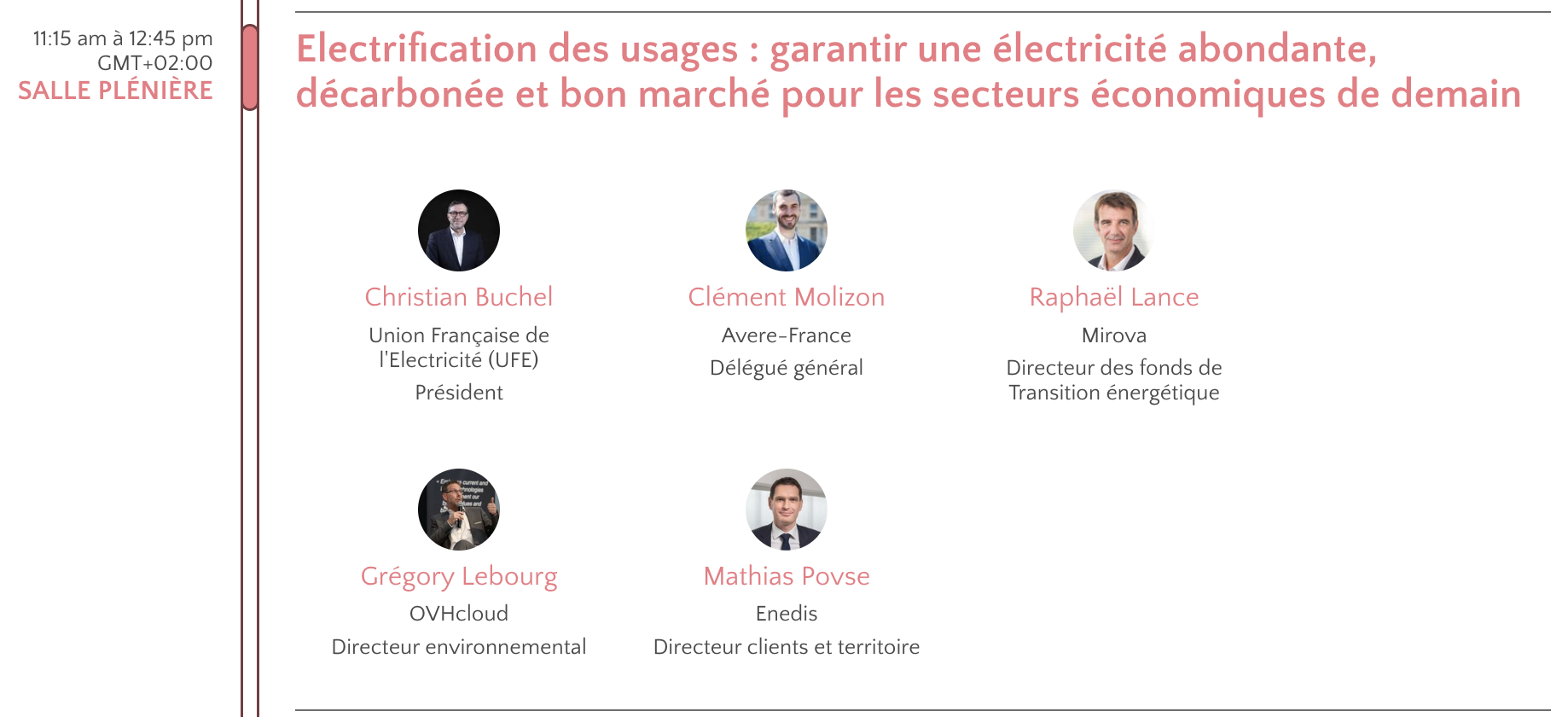 Notre Président, Christian Buchel, participera le 15 octobre à 11h15 à la table ronde “Électrification des usages : garantir une électricité abondante, décarbonée et bon marché pour les secteurs économiques de demain” aux côtés de Clément Molizon, Délégué Général à l’Avere-France, Raphaël Lance, Directeur des fonds de Transition énergétique à Mirova, Grégory Lebourg, Directeur environnemental à OVHcloud, Mathias Povse, Directeur clients et territoire à Enedis.