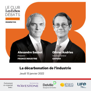 Au programme du Club Les Echos Débats – Prospective du jeudi 13 janvier 2022 : Alexandre Saubot, président de France Industrie et Olivier Andries, directeur général de Safran, débattent sur le thème « La décarbonation de l’industrie ».