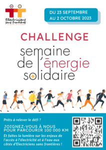 La Semaine de l’énergie solidaire a été créée par l’ONG française Electriciens sans frontières en 2013 pour sensibiliser aux problématiques d’accès à l’électricité et à l’eau dans le monde. Du samedi 23 septembre au lundi 2 octobre 2023, nous avons une semaine pour montrer que des solutions existent pour lutter contre les inégalités d’accès à l’électricité et à l’eau dans le monde avec des événements partout en France et un challenge solidaire à relever.
