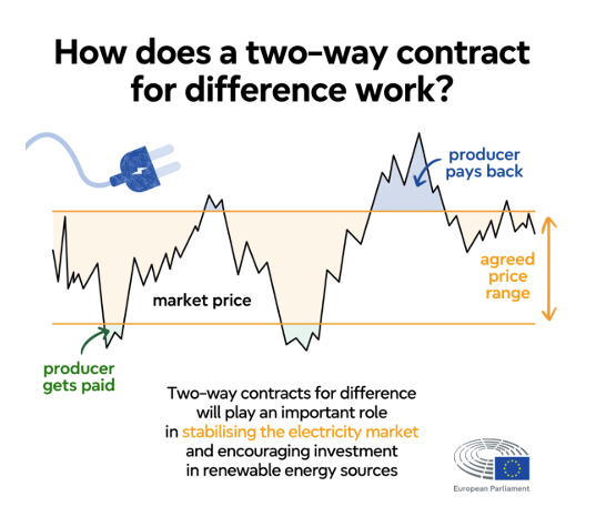 Plus récemment, la réforme du marché européen de l’électricité adoptée en juin 2024 précise que les mécanismes de soutien direct des prix pour les investissements dans de nouvelles installations de production d’électricité à partir de l’énergie éolienne, solaire, géothermique, hydraulique au fil de l’eau et de l’énergie nucléaire doivent, pour les contrats conclus après le 17 juillet 2017, prendre la forme de contrats pour différence (Contract for Difference (CfD) en anglais) bidirectionnels ou de mécanismes équivalents. (Règlement (UE) 2024/1747 modifiant l’article 19 quinquies, paragraphes 1 et 2, du Règlement (UE) 2019/943).
