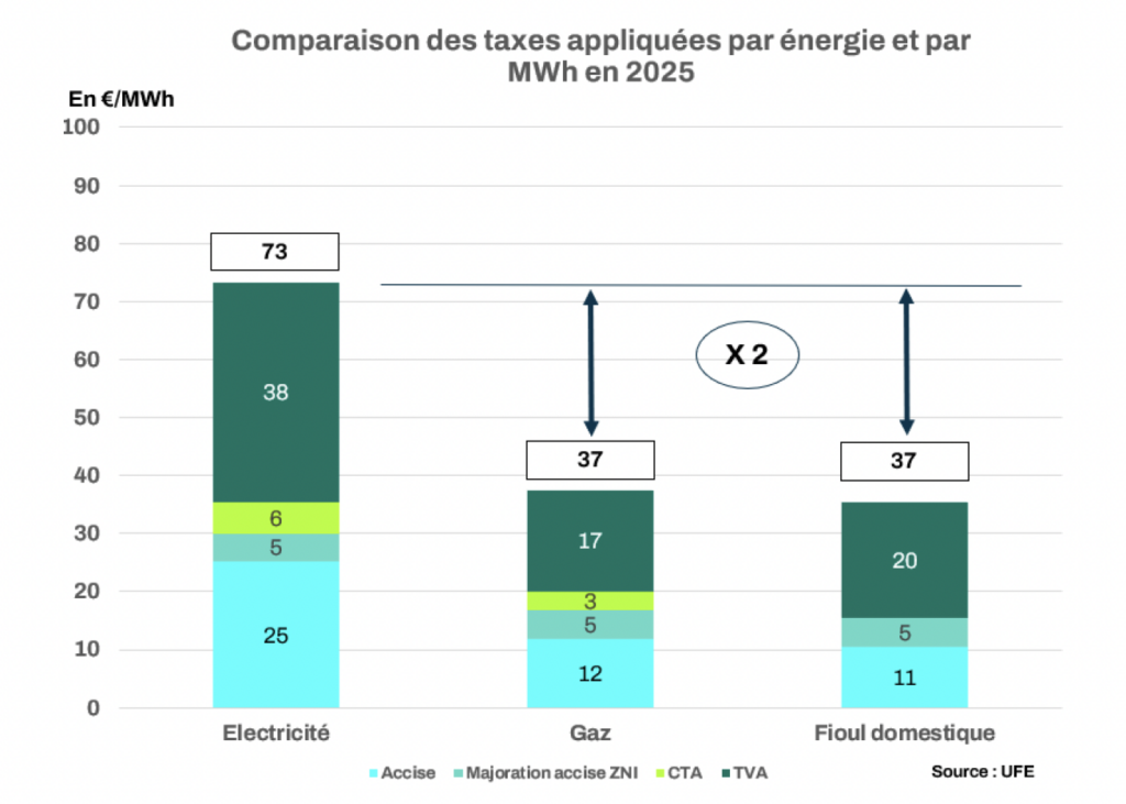 Ainsi, en 2025 les taxes appliquées sur l’électricité sont deux fois plus importantes que celles appliquées au gaz et au fioul domestique.